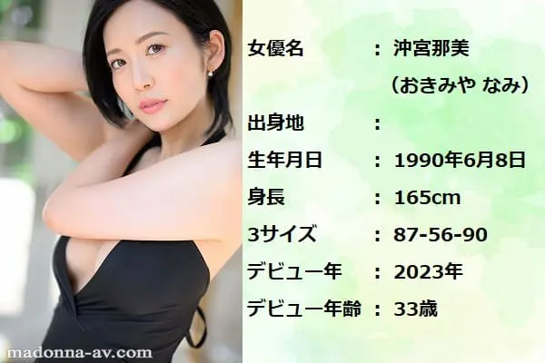 デビュー作品タイトル | 誕生 沖宮那美 33歳 AV DEBUT 100年に1度の大型新人、現る―。 |